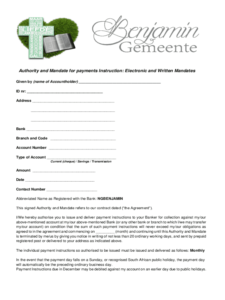 Authority and Mandate for payments Instruction: Electronic and Written Mandates Given by (name of Accountholder) ___ ID nr: ___ Address ___ ___ ___ Bank ___ Branch and Code ___ Account Number ___