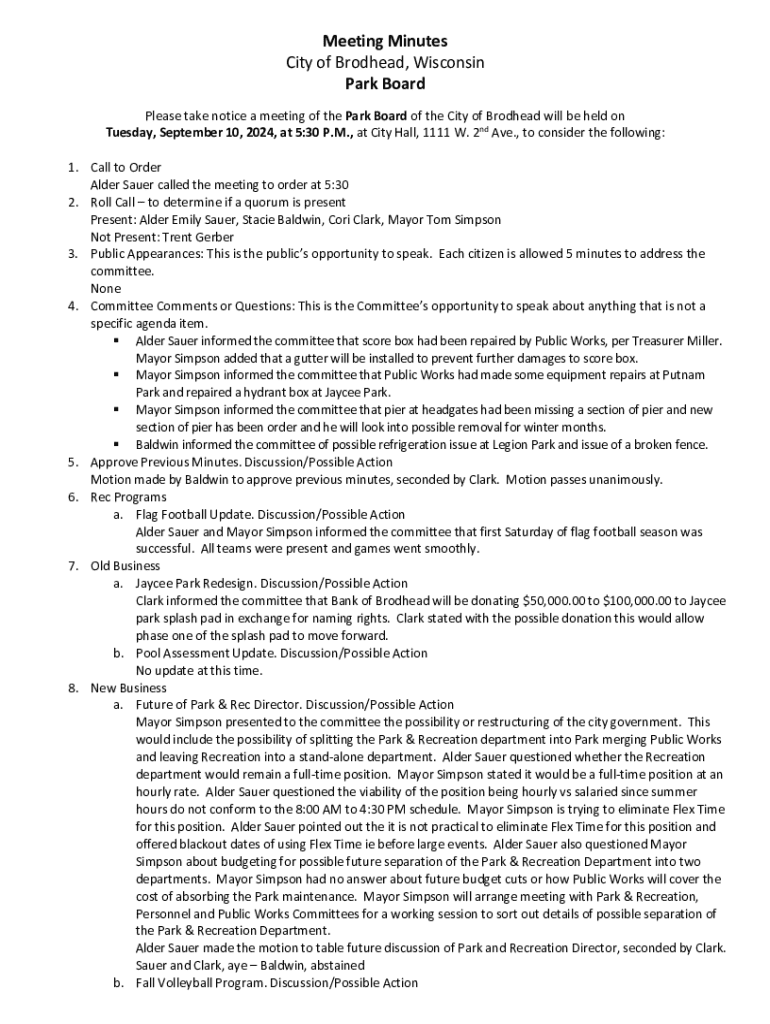 Meeting Minutes City of Brodhead, Wisconsin Park Board Please take notice a meeting of the Park Board of the City of Brodhead will be held on Tuesday, September 10, 2024, at 5:30 P.M., at City Hall,
