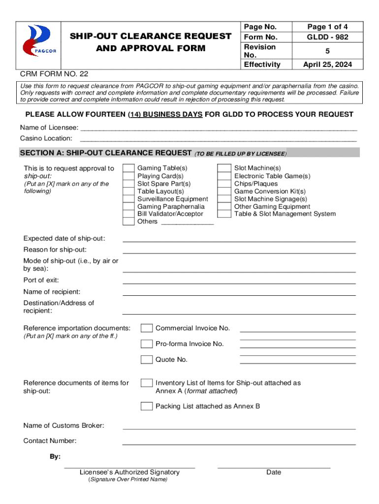SHIPOUT CLEARANCE REQUEST AND APPROVAL FORMPage No. Form No. Revision No. EffectivityPage 1 of 4 GLDD 982 5 April 25, 2024CRM FORM NO. 22 Use this form to request clearance from PAGCOR to shipout gaming equipment and/or paraphernalia from the casino. Only requests with correct and complete information and complete documentary requirements will be processed. Failure to provide correct and complete information could result in rejection of processing this request.PLEASE ALLOW FOURTEEN (14)