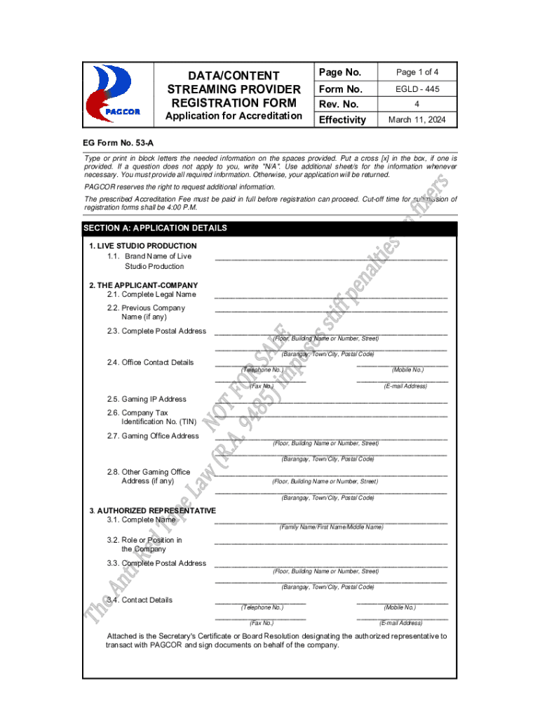 This form serves as an application for accreditation to register as a Data/Content Streaming Provider with PAGCOR (Philippine Amusement and Gaming Corporation). It requires comprehensive details about the applicant company, including legal information, contact details, authorized representatives, and compliance with documentary requirements necessary for operating a live gaming facility.