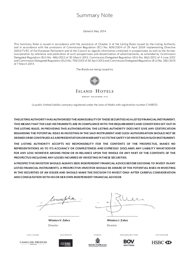 This Summary Note provides an overview of the securities being offered by Island Hotels Group Holdings p.l.c., including information about the Issuer, the financial forecasts, risks associated with the investment, and the structure of the bond issuance. It outlines the expected use of proceeds from the bond issue and contains key compliance information as mandated by the Listing Authority and relevant regulations.