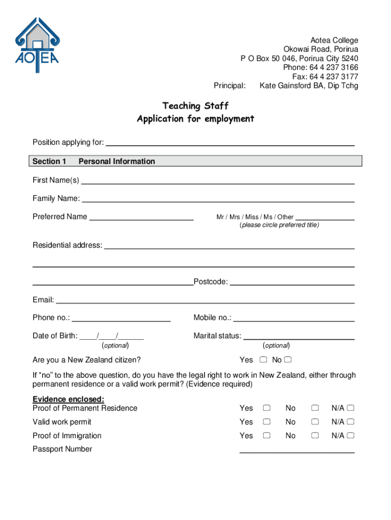 Aotea College Okowai Road, Porirua P O Box 50 046, Porirua City 5240 Phone: 64 4 237 3166 Fax: 64 4 237 3177 Principal: Kate Gainsford BA, Dip TchgTeaching Staff Application for employment Position