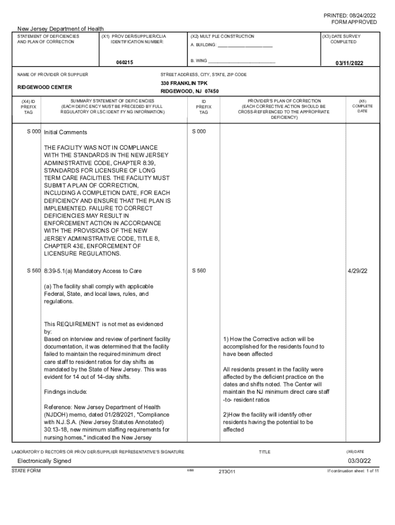 Get the free New Jersey Department of Health 03/11/2022 S 000 Initial ...
