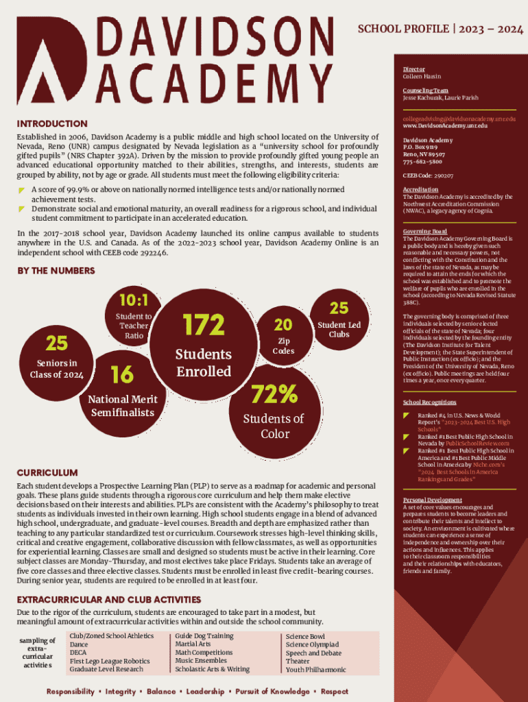 SCHOOL PROFILE | 2023 2024Director Colleen Harsin Counseling Team Jesse Kachurak, Laurie Parishcollegeadvising@davidsonacademy.unr.edu www.DavidsonAcademy.unr.eduINTRODUCTION Established in 2006,