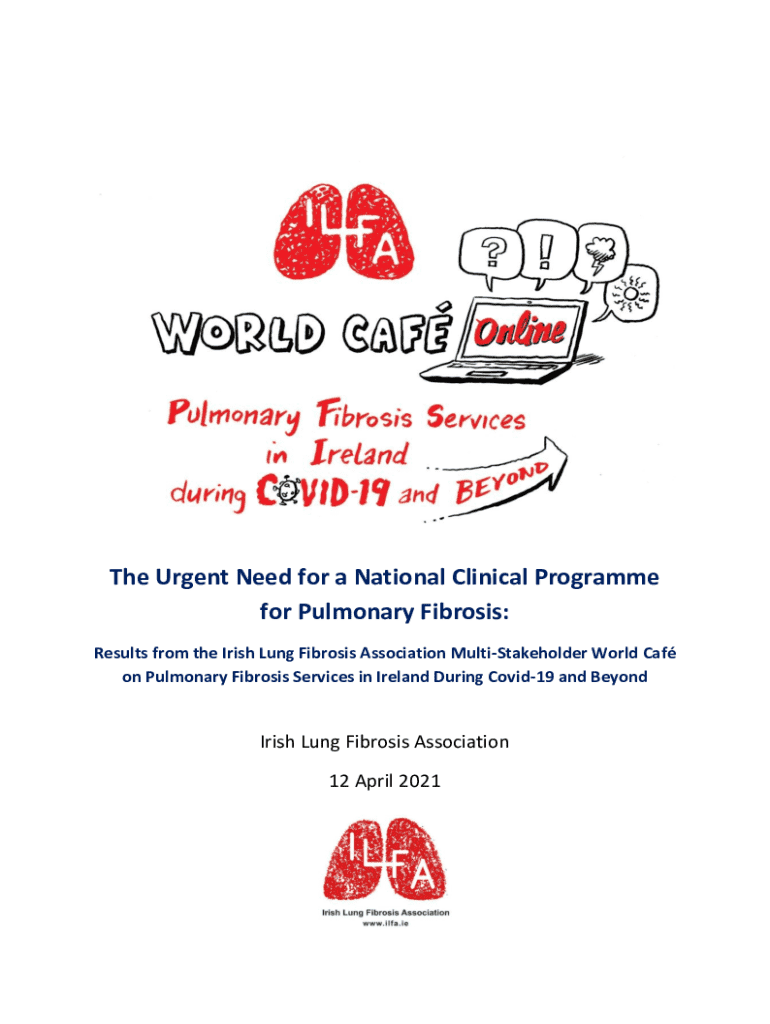 This document discusses the results from the ILFA World Café event, highlighting the urgent need for a National Clinical Programme for Pulmonary Fibrosis in Ireland. It addresses significant gaps in care, experiences of patients, and suggestions for improvements in healthcare delivery before and during the COVID-19 pandemic.