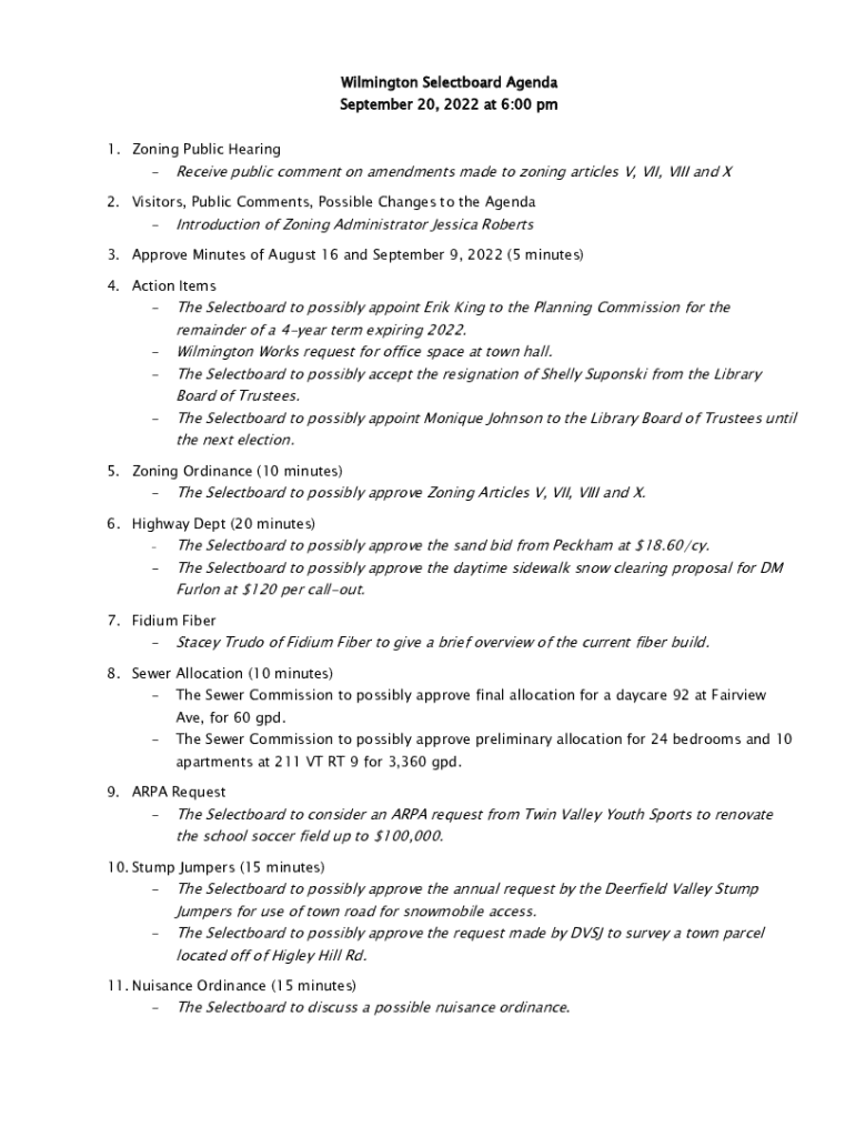 Wilmington Selectboard AgendaSeptember 20, 2022 at 6:00 pm 1. Zoning Public Hearing Receive public comment on amendments made to zoning articles V, VII, VIII and X2. Visitors, Public Comments, Possible