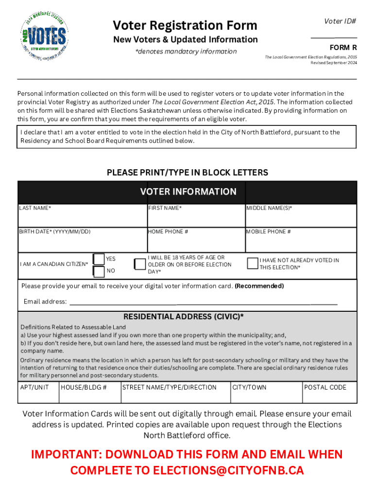 This form is used for registering new voters or updating existing voter information in the province\'s Voter Registry as mandated by The Local Government Election Act, 2015. It ensures that residents of North Battleford meet the eligibility requirements to vote in upcoming elections.