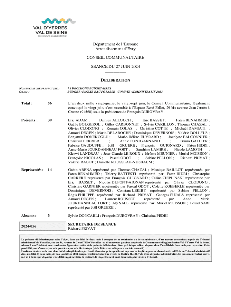 Dpartement de lEssonne Arrondissement dEvry CONSEIL COMMUNAUTAIRE SEANCE DU 27 JUIN 2024 ___DELIBERATION NOMENCLATURE PREFECTURE : OBJET :7.1 DECISIONS BUDGETAIRES BUDGET ANNEXE EAU POTABLE COMPTE