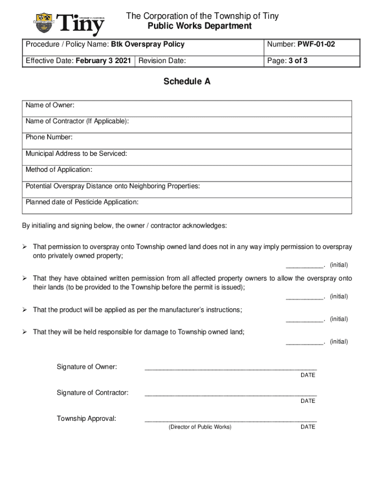 This document outlines the policy and procedures for the application of Btk pesticide on private properties that may result in overspray onto municipally owned lands within the Township of Tiny. It details requirements for property owners, including obtaining approval and ensuring public safety regarding the use of pesticides.