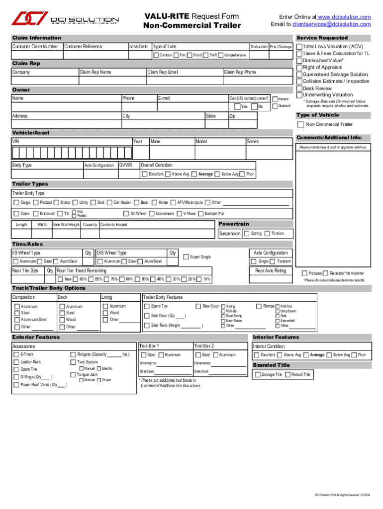 VALURITE Request Form NonCommercial TrailerEnter Online at www.dcisolution.com Email to clientservices@dcisolution.comClaim Information Customer Claim NumberService Requested Customer ReferenceLoss
