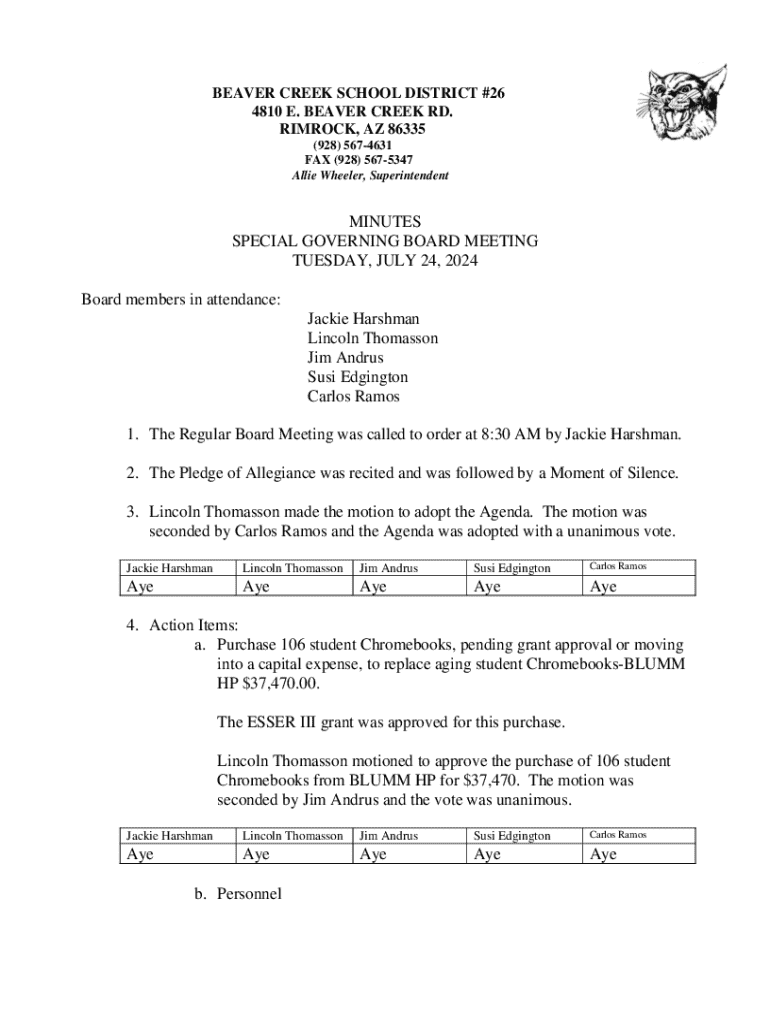 BEAVER CREEK SCHOOL DISTRICT #26 4810 E. BEAVER CREEK RD. RIMROCK, AZ 86335 (928) 5674631 FAX (928) 5675347 Allie Wheeler, SuperintendentMINUTES SPECIAL GOVERNING BOARD MEETING TUESDAY, JULY 24, 2024