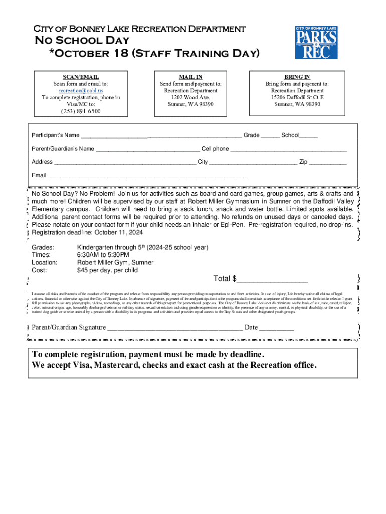 City of Bonney Lake Recreation DepartmentNo School Day *October 18 (Staff Training Day) SCAN/EMAIL Scan form and email to: recreation@cobl.us To complete registration, phone in Visa/MC to:MAIL IN