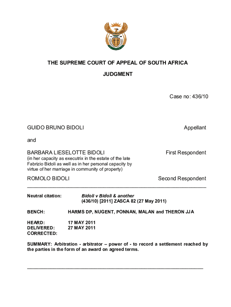 This document contains the judgment from the Supreme Court of Appeal of South Africa regarding the arbitration case between Guido Bruno Bidoli and Barbara Lieselotte Bidoli, concerning disputes over a jointly held property and funds resulting from their business relationships. It discusses the powers of arbitrators, the validity of settlement agreements, and the requirements for an arbitration award to be enforceable by court.