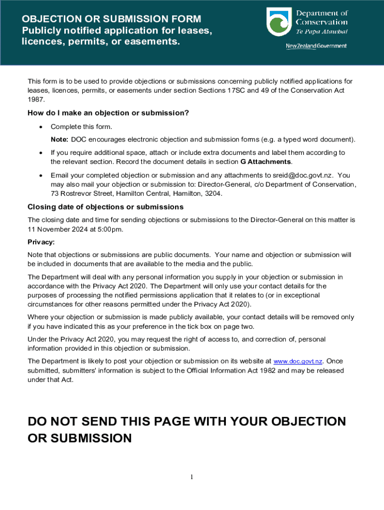 This form is intended for providing objections or submissions regarding publicly notified applications for leases, licenses, permits, or easements as per the Conservation Act 1987. It also details the process for submitting objections or submissions and the privacy considerations involved.