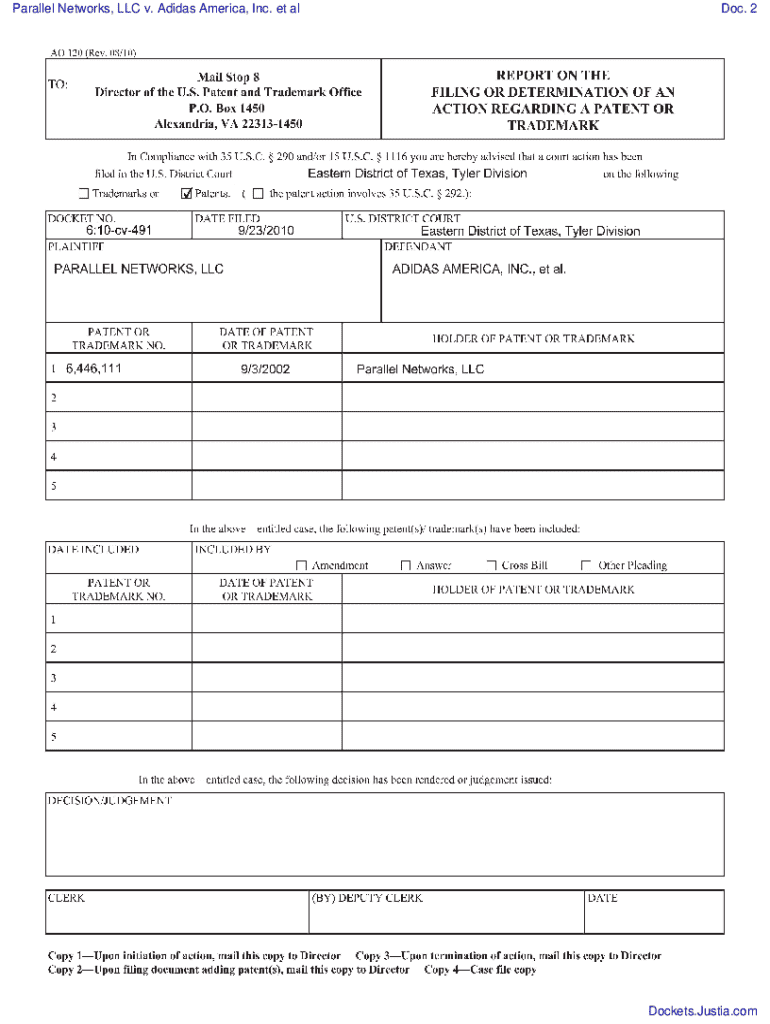 Parallel Networks, LLC v. Adidas America, Inc. et alDoc. 2AO 120 (Rev. 08110)REPORT ON THE FILING OR DETERMINATION OF AN ACTION REGARDING A PATENT OR TRADEMARKMail Stop 8 Director of the U.S. Patent