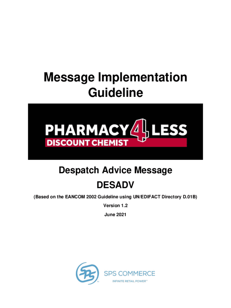 This guideline provides suppliers with the necessary information to implement sending Despatch Advice messages (DESADV) to Pharmacy 4 Less (P4L), following the EANCOM 2002 standards and UN/EDIFACT specifications. It outlines the structure of messages, segments, and data requirements necessary for successful electronic data interchange, ensuring efficient processing and validation of shipments.