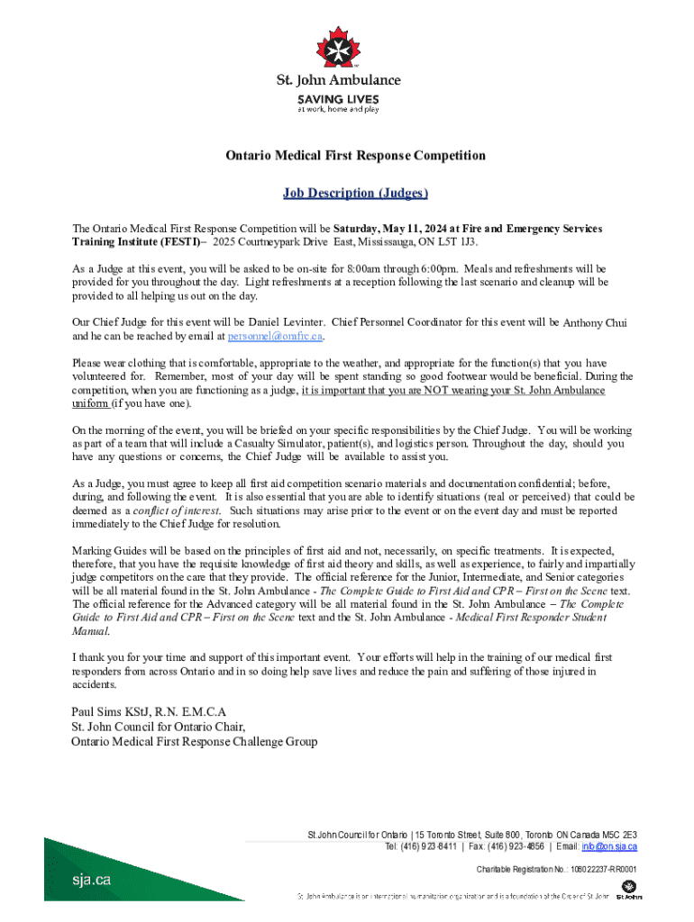 Ontario Medical First Response Competition Job Description (Judges) The Ontario Medical First Response Competition will be Saturday, May 11, 2024 at Fire and Emergency Services Training Institute