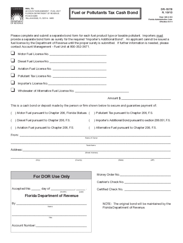 This document serves as a cash bond or deposit required by the Florida Department of Revenue to secure payment for various fuel-related licenses and taxes. Applicants must provide a separate bond form for each fuel product type or taxable pollutant, and must ensure proper surety is submitted to obtain a fuel license.