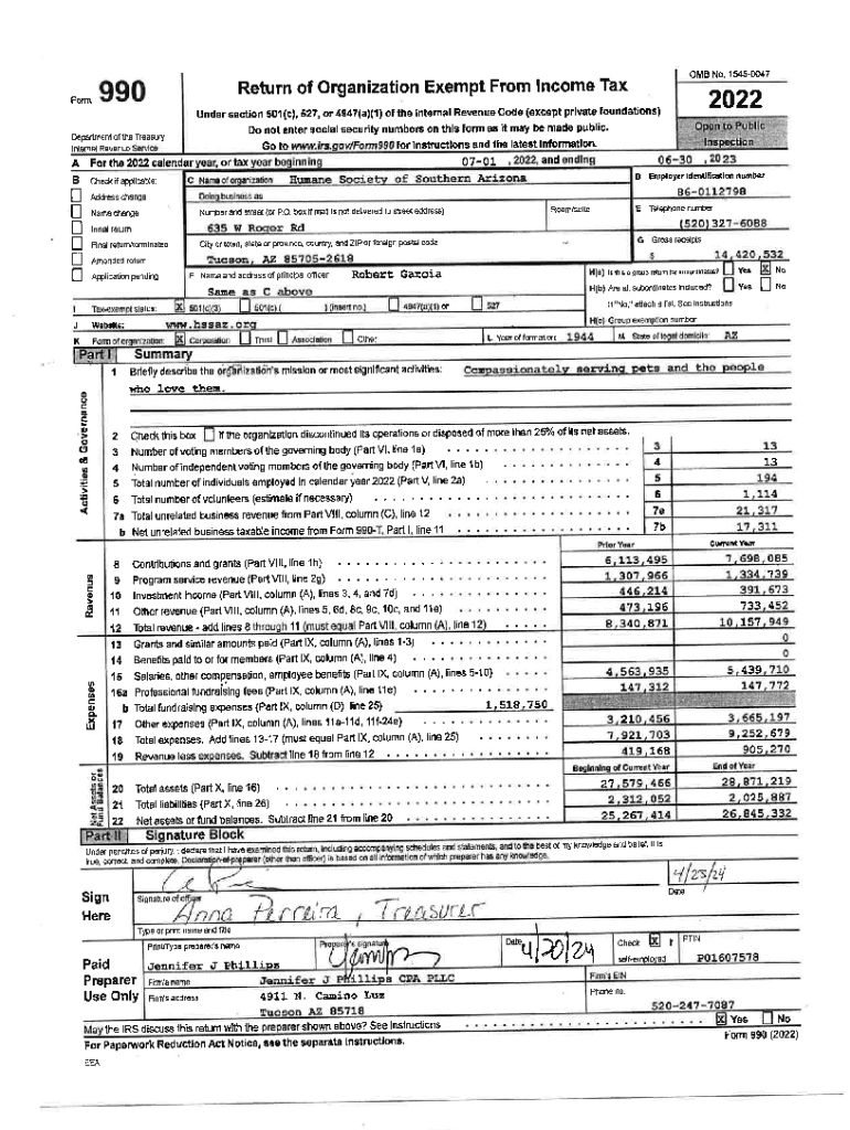 This document provides a comprehensive overview of the Humane Society of Southern Arizona\'s financial activities, program service accomplishments, and governance for the year 2022. It includes detailed financial statements, descriptions of significant programs, and information on contributions and expenses related to its charitable activities.