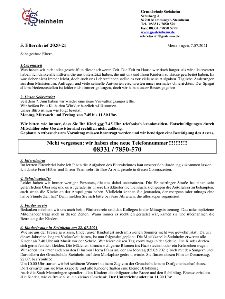 Grundschule Steinheim Schulweg 2 87700 MemmingenSteinheim Tel. 08331 / 7850 570 Fax: 08331 / 7850 5799 www.gssteinheim.de sekretariat@gsstmm.de5. Elternbrief 202021Memmingen, 7.07.2021Sehr geehrte