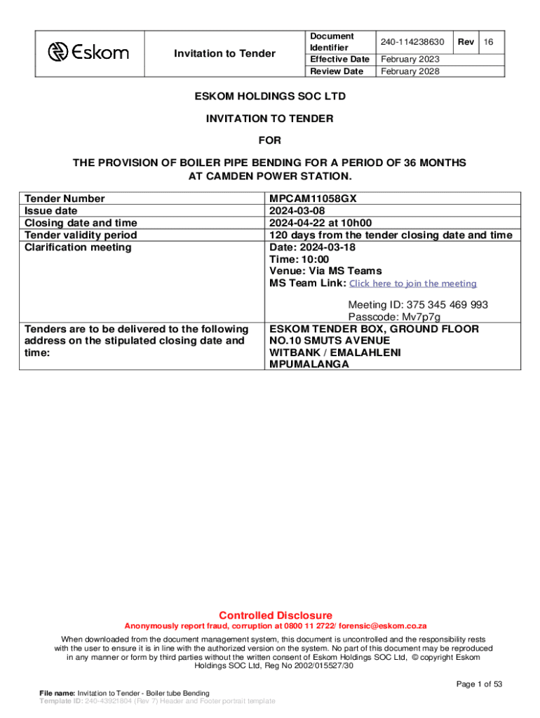 This document serves as an invitation from Eskom Holdings SOC Ltd for the submission of tenders for the provision of boiler pipe bending services at Camden Power Station over a period of 36 months. It provides details on tender submission requirements, timelines, eligibility criteria, and necessary documentation.