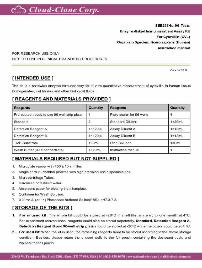 SEB297Hu 96 Tests Enzymelinked Immunosorbent Assay Kit For Cytovillin (CVL) Organism Species: Homo sapiens (Human) Instruction manual FOR RESEARCH USE ONLY NOT FOR USE IN CLINICAL DIAGNOSTIC PROCEDURES
