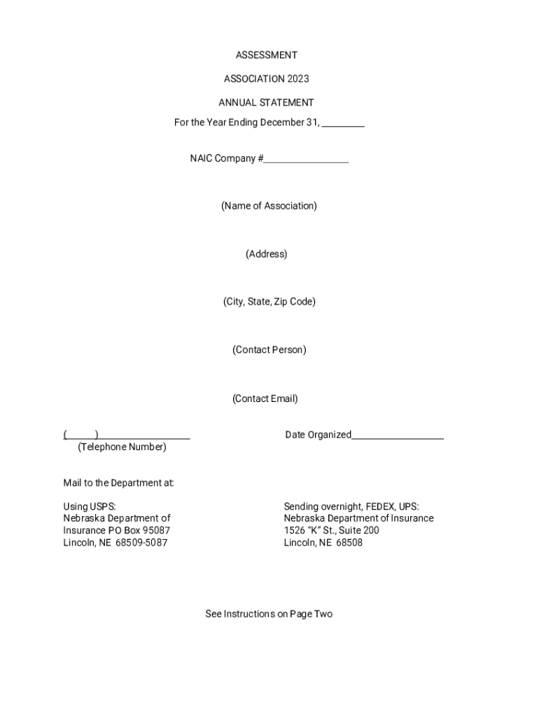 ASSESSMENT ASSOCIATION 2023 ANNUAL STATEMENT For the Year Ending December 31, NAIC Company #(Name of Association)(Address)(City, State, Zip Code)(Contact Person)(Contact Email) () (Telephone Number)Date