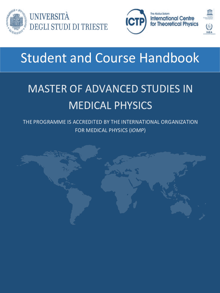 This handbook provides essential information for students enrolled in the Master of Advanced Studies in Medical Physics (MMP) at ICTP and Trieste University. It outlines the program structure, key contacts, academic requirements, and practical guidance for students as they navigate their studies and training in medical physics, including clinical training, coursework, and thesis preparation.