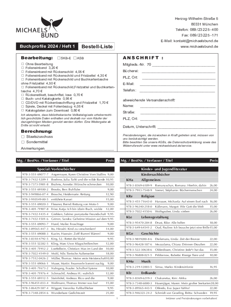 Herzog Wilhelm Strae 5 80331 Mnchen Telefon: 089 / 23 22 5 400 Fax: 089 / 23 22 5 171BestellListeBuchprofile 2024 / Heft 1 Bearbeitung: SKBEEMail: kontakt@michaelsbund.de www.michaelsbund.deANSCHRIFT
