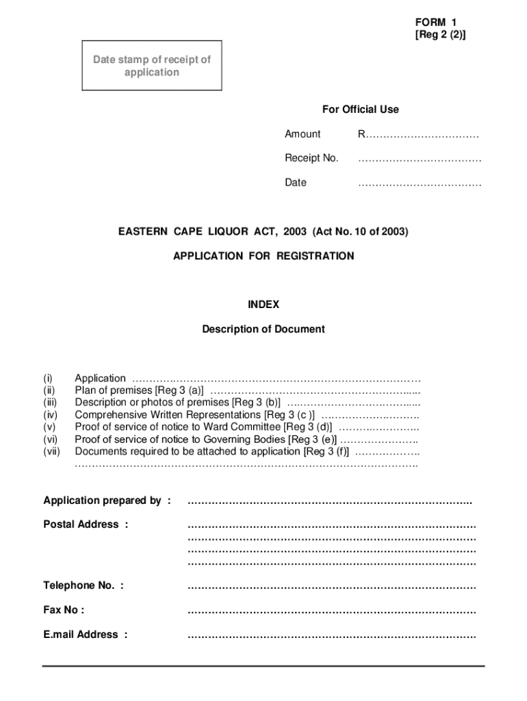 FORM 1 [Reg 2 (2)] Date stamp of receipt of applicationFor Official Use AmountRReceipt No.DateEASTERN CAPE LIQUOR ACT, 2003 (Act No. 10 of 2003) APPLICATION FOR REGISTRATIONINDEX Description of Document(i)