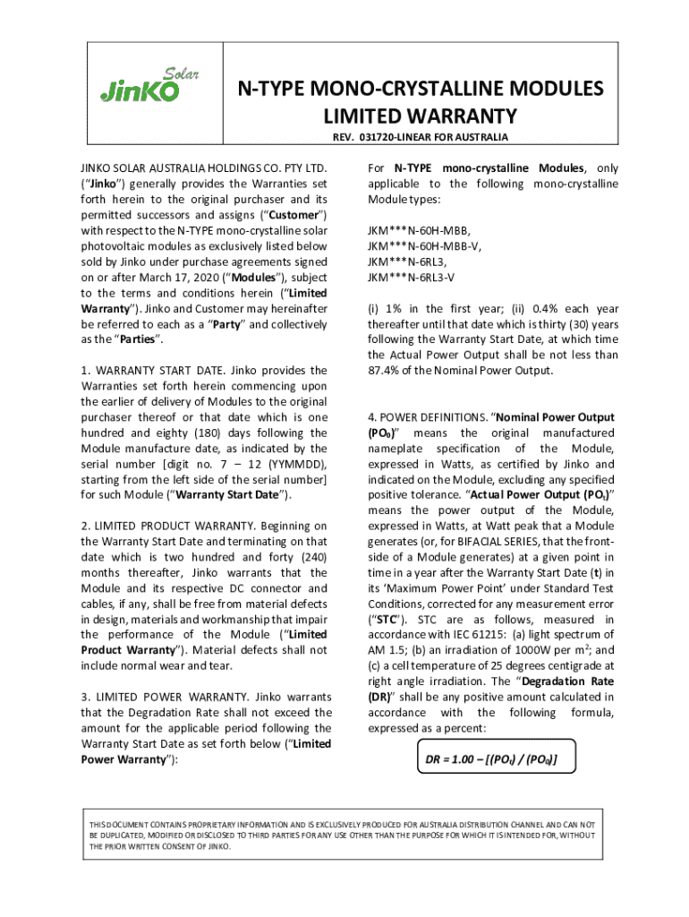 NTYPE MONOCRYSTALLINE MODULES LIMITED WARRANTY REV. 031720LINEAR FOR AUSTRALIAJINKO SOLAR AUSTRALIA HOLDINGS CO. PTY LTD. (Jinko) generally provides the Warranties set forth herein to the original
