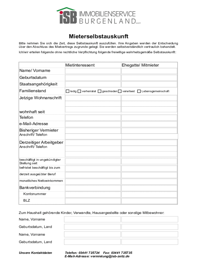 Mieterselbstauskunft Bitte nehmen Sie sich die Zeit, diese Selbstauskunft auszufllen. Ihre Angaben werden der Entscheidung ber den Abschluss des Mietvertrags zugrunde gelegt. Sie werden selbstverstndlich