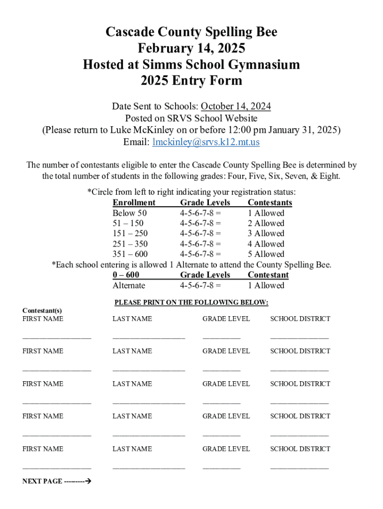 This document serves as the entry form for the Cascade County Spelling Bee, providing details about registration, eligibility, and contact information for participants. It outlines the number of contestants allowed based on school enrollment and includes sections for contestant information and staff attendance. The form must be submitted by January 31, 2025.