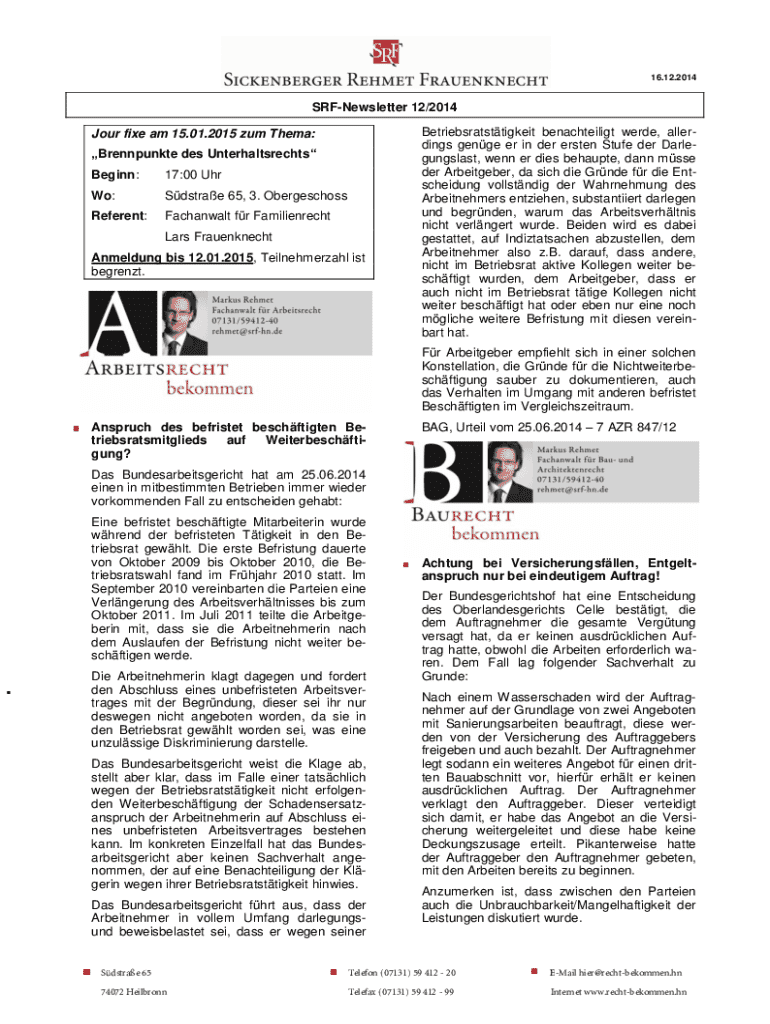 16.12.2014SRFNewsletter 12/2014 Jour fixe am 15.01.2015 zum Thema: Brennpunkte des Unterhaltsrechts Beginn:17:00 UhrWo:Sdstrae 65, 3. ObergeschossReferent:Fachanwalt fr Familienrecht Lars FrauenknechtAnmeldung