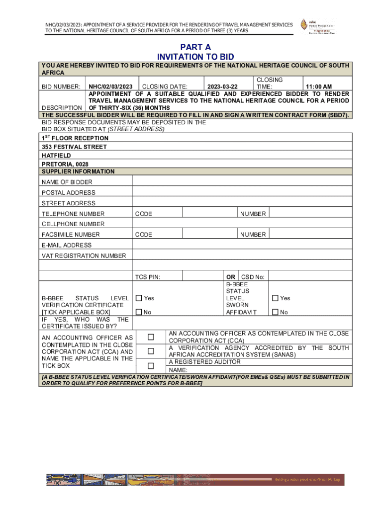 NHC/02/03/2023: APPOINTMENT OF A SERVICE PROVIDER FOR THE RENDERING OF TRAVEL MANAGEMENT SERVICES TO THE NATIONAL HERITAGE COUNCIL OF SOUTH AFRICA FOR A PERIOD OF THREE (3) YEARSPART A INVITATION