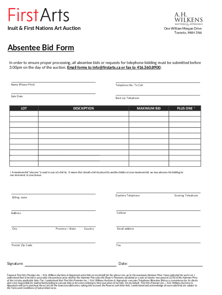 Inuit & First Nations Art AuctionOne William Morgan Drive Toronto, M4H 1N6Absentee Bid Form In order to ensure proper processing, all absentee bids or requests for telephone bidding must be submitted