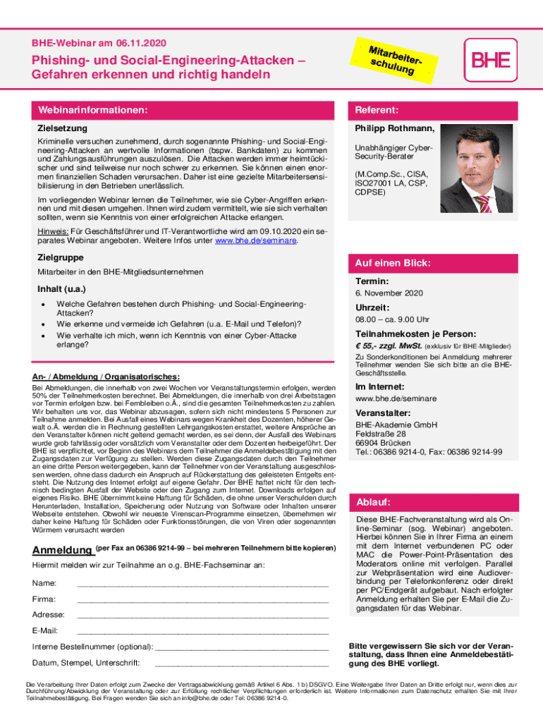 BHEWebinar am 06.11.2020Phishing und SocialEngineeringAttacken Gefahren erkennen und richtig handeln Webinarinformationen:Referent:ZielsetzungPhilipp Rothmann,Kriminelle versuchen zunehmend, durch