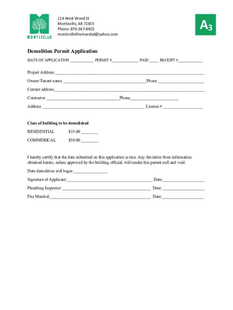 114 West Wood St Monticello, AR 71655 Phone: 8703674402 monticellofiremarshal@yahoo.comA3Demolition Permit Application DATE OF APPLICATION ___ PERMIT #___ PAID ___ RECEIPT #___Project Address ___