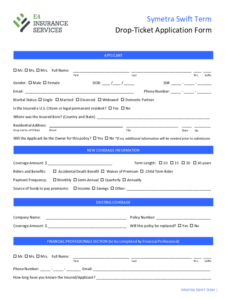 This application form is utilized for applying for Symetra Swift Term life insurance, capturing essential details about the applicant and the insured, including personal information, coverage options, existing coverage information, and details for financial professionals.