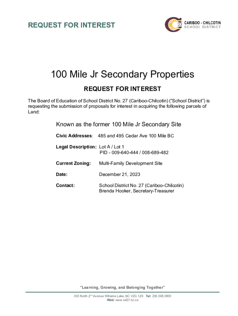 This document outlines the request for proposals for the acquisition of the former 100 Mile Junior Secondary Site, comprising two parcels of land, aimed at identifying interested and qualified potential buyers. It includes details on the properties, response process, and terms and conditions for submission.