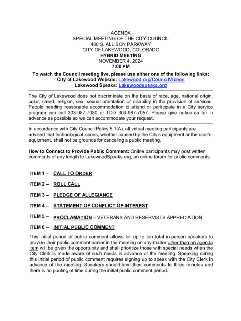 AGENDA SPECIAL MEETING OF THE CITY COUNCIL 480 S. ALLISON PARKWAY CITY OF LAKEWOOD, COLORADO HYBRID MEETING NOVEMBER 4, 2024 7:00 PM To watch the Council meeting live, please use either one of the
