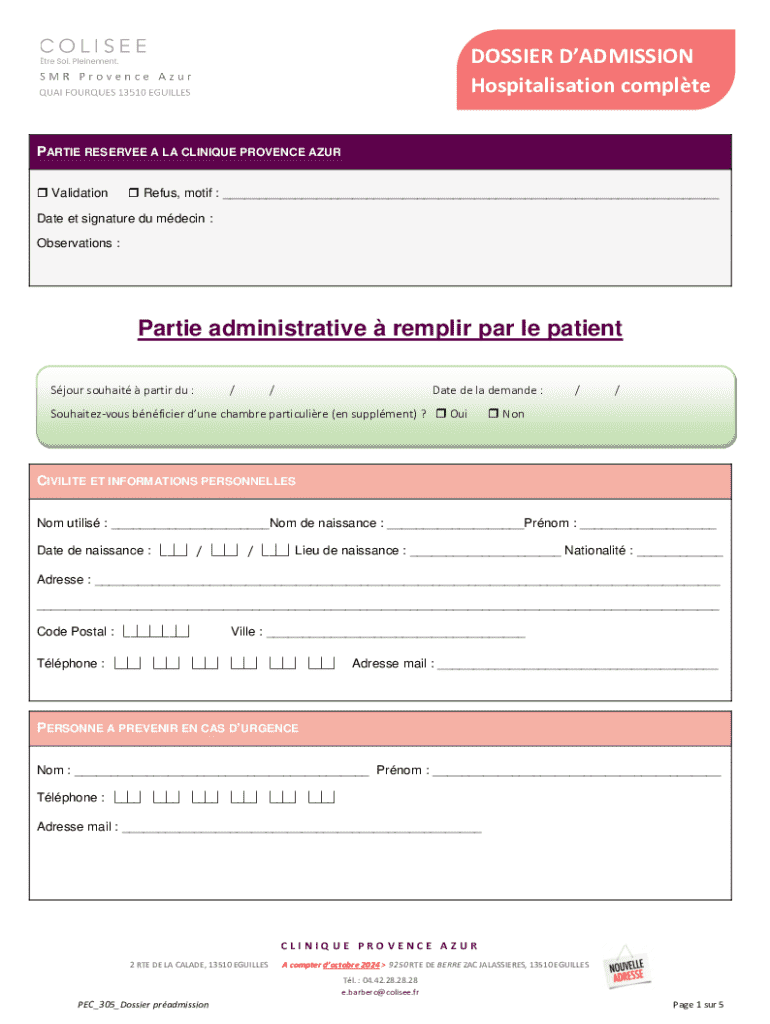 DOSSIER DADMISSION Hospitalisation complte PARTIE RESERVEE A LA CLINIQUE PROVENCE AZUR Validation Refus, motif : ___Date et signature du mdecin : Observations :Partie administrative remplir par le