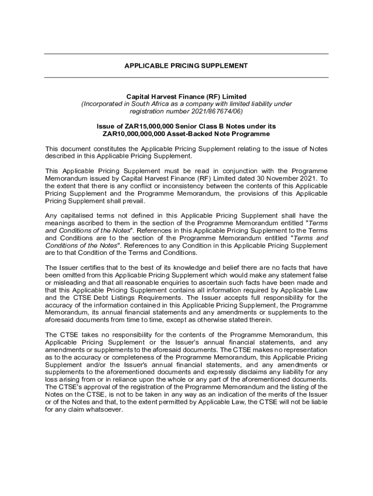 This document serves as the Applicable Pricing Supplement for the issuance of ZAR15,000,000 Senior Class B Notes under the ZAR10,000,000,000 Asset-Backed Note Programme by Capital Harvest Finance (RF) Limited. It provides detailed information including terms, conditions, and descriptions of the Notes, as well as compliance with applicable regulations and the Programme Memorandum.