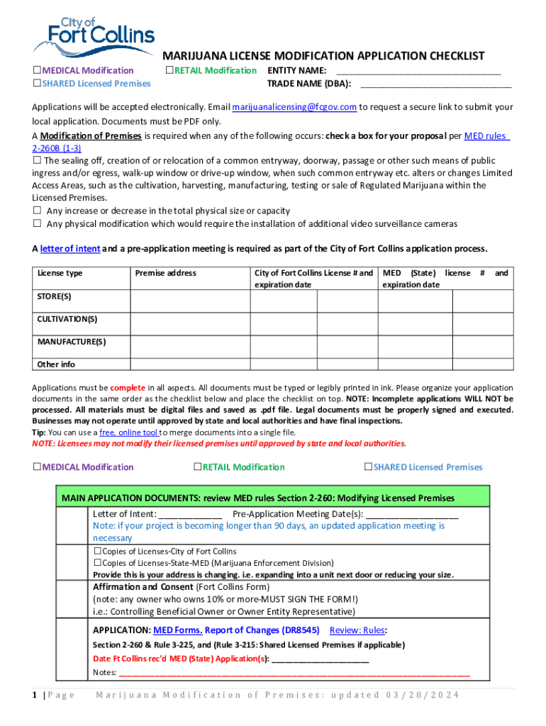 MEDICAL Modification SHARED Licensed PremisesMARIJUANA LICENSE MODIFICATION APPLICATION CHECKLIST RETAIL ModificationENTITY NAME: ___ TRADE NAME (DBA): ___Applications will be accepted electronically.