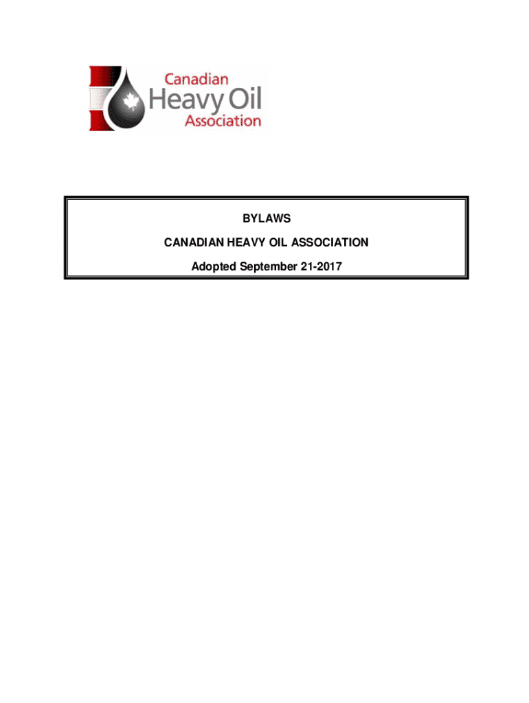 The Bylaws outline the governance, management, and operational structure of the Canadian Heavy Oil Association. They detail the definitions, membership categories, general meetings, board of directors\' roles, and financial management procedures, among other essential organizational aspects. These Bylaws were adopted on September 21, 2017.
