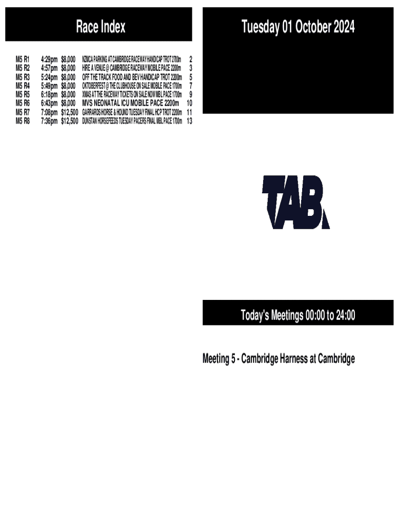 Race Index M5 R1 M5 R2 M5 R3 M5 R4 M5 R5 M5 R6 M5 R7 M5 R84:29pm 4:57pm 5:24pm 5:49pm 6:18pm 6:43pm 7:08pm 7:36pm$8,000 $8,000 $8,000 $8,000 $8,000 $8,000 $12,500 $12,500NZMCA PARKING AT CAMBRIDGE