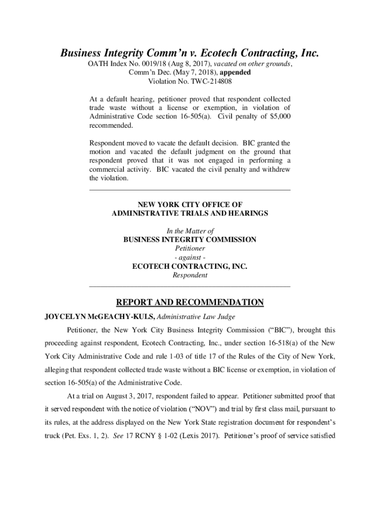 Business Integrity Commn v. Ecotech Contracting, Inc. OATH Index No. 0019/18 (Aug 8, 2017), vacated on other grounds, Commn Dec. (May 7, 2018), appended Violation No. TWC214808 At a default hearing,