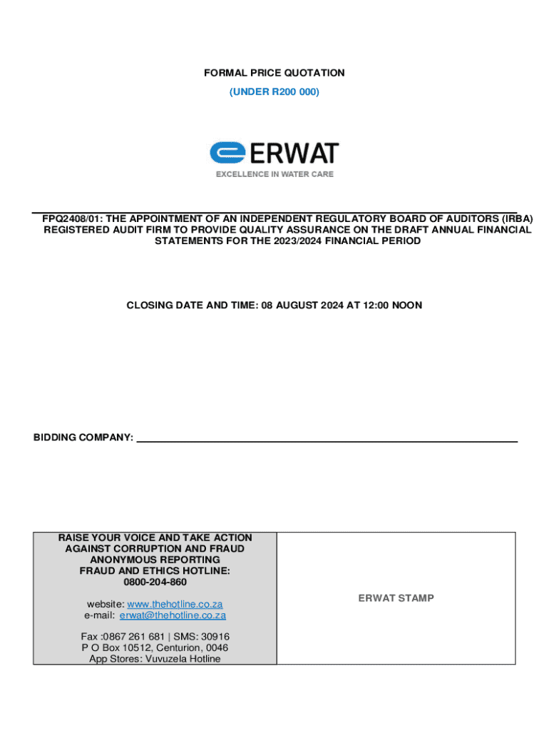 FORMAL PRICE QUOTATION (UNDER R200 000)FPQ2408/01: THE APPOINTMENT OF AN INDEPENDENT REGULATORY BOARD OF AUDITORS (IRBA) REGISTERED AUDIT FIRM TO PROVIDE QUALITY ASSURANCE ON THE DRAFT ANNUAL FINANCIAL