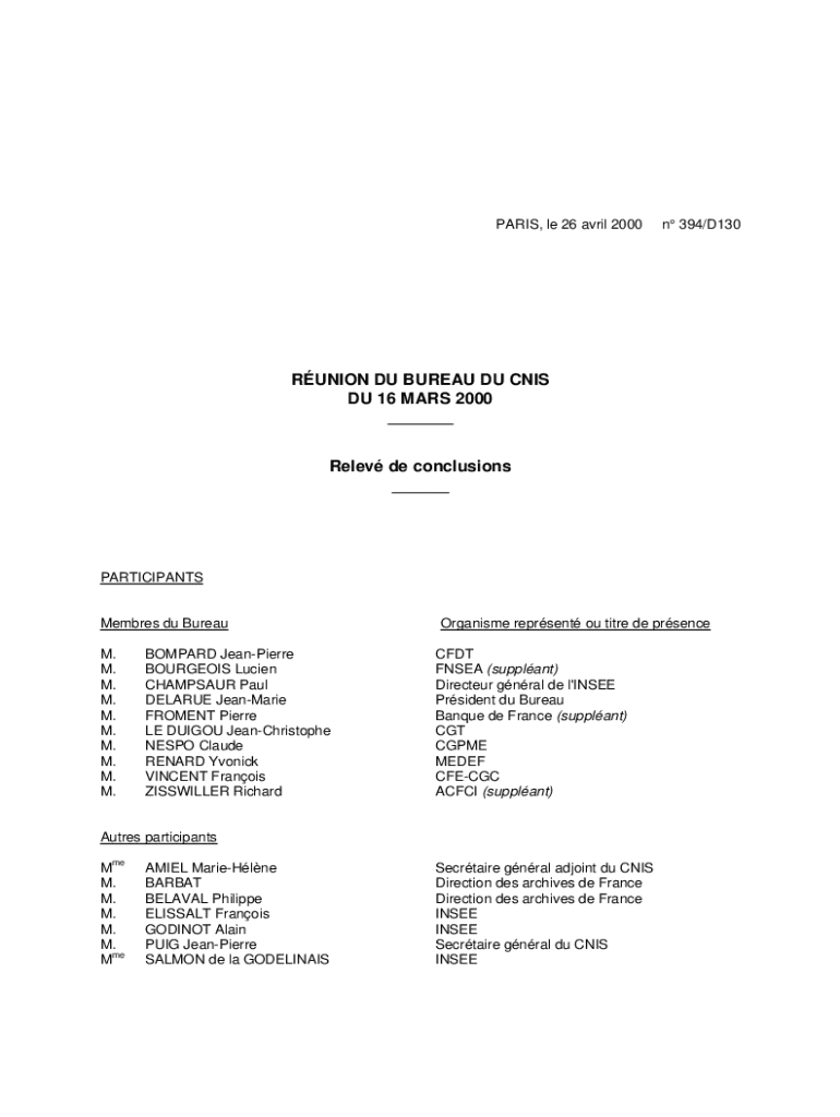 PARIS, le 26 avril 2000n 394/D130RUNION DU BUREAU DU CNIS DU 16 MARS 2000 ___ Relev de conclusions ___PARTICIPANTSMembres du Bureau M. M. M. M. M. M. M. M. M. M.BOMPARD JeanPierre BOURGEOIS Lucien
