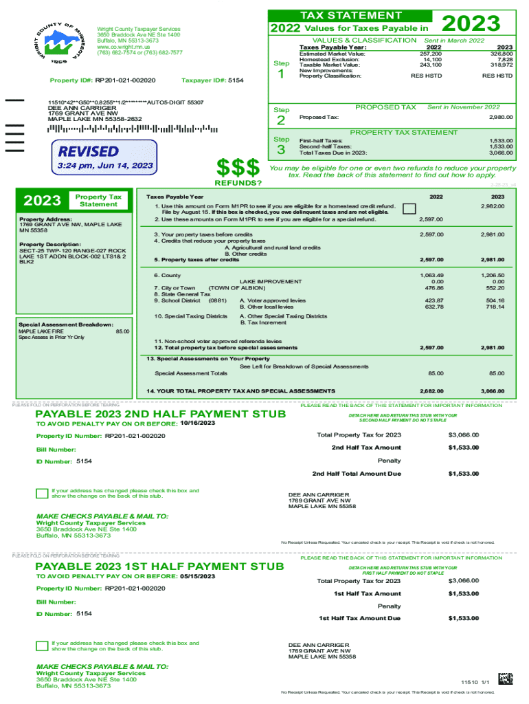 RP201021002020_D _TAX STATEMENT2022 Values for Taxes Payable inWright County Taxpayer Services 3650 Braddock Ave NE Ste 1400 Buffalo, MN 553133673 www.co.wright.mn.us (763) 6827574 or (763) 6827577VALUES